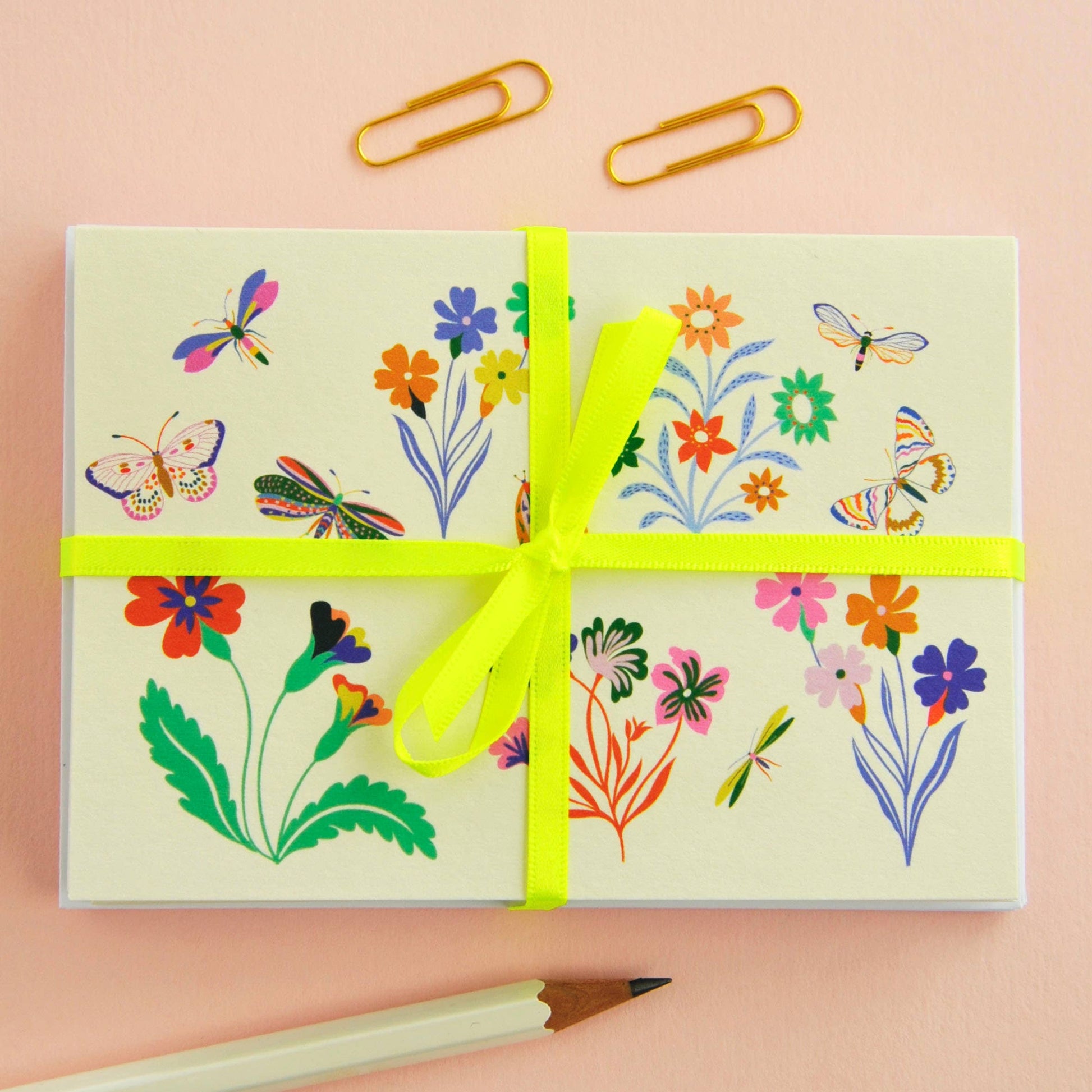 Printed on 350gsm matt card in the UK, the cards are tied together with a neon satin ribbon. Each card measures 120mm x 85mm and comes with a white envelope.