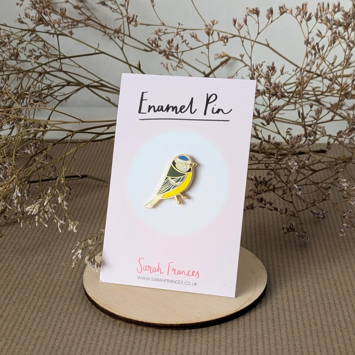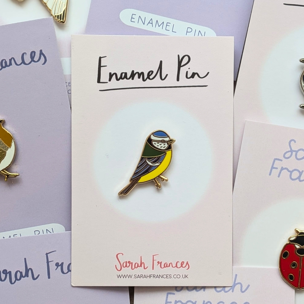 Based on an original illustration, this bluetit enamel pin is made in Devon. Perfect for bird lovers, it looks great on any jacket, bag or hat. Made with shiny gold-coloured metal and hard enamel, the pin measures 1 inch (25mm) from beak to tail It has a black rubber clasp on the back and comes presented on a pretty backing card.