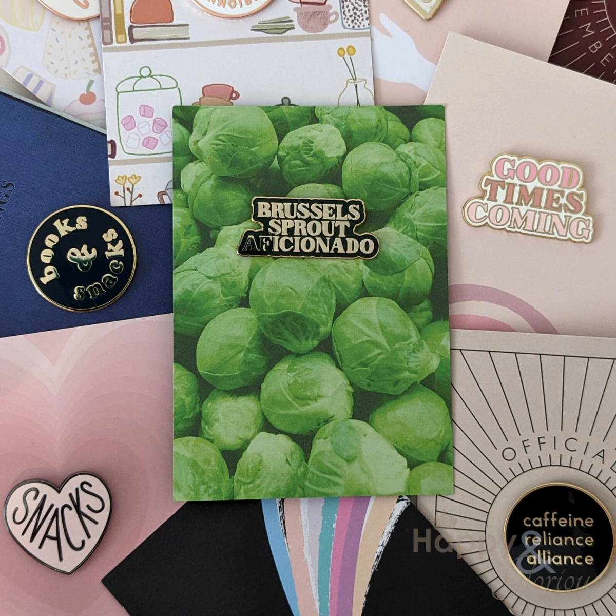 This cute and positive enamel pin badge features the words 'brussels sprouts aficionado' in gold coloured lettering on a dark green background. Show that you really know your stuff when it comes to this festive vegetable!