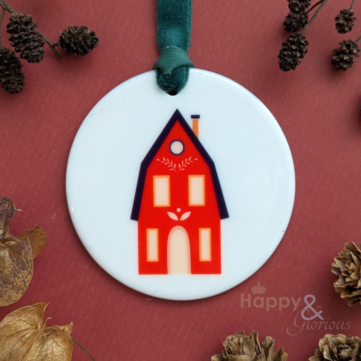 The natural soft white ceramic background is decorated with a lovely folksy chalet in muted blue and red. This decoration is strung with a bottle green velvet ribbon, and has a Scandi feel that will work beautifully with a Nordic themed tree.