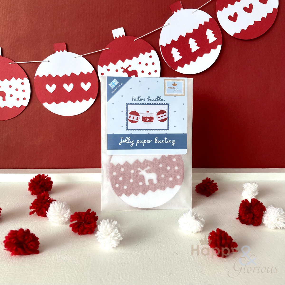This jolly papercut bunting is designed and made by Happy & Glorious owner, Kate Tompsett. In classic red and white, the festive papercut baubles are perfect for making your Christmas pop!