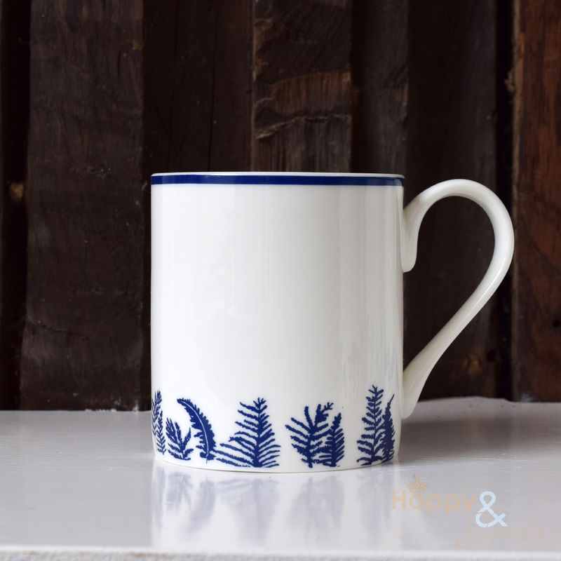 This fine bone china mug features a border of navy silhouetted fern leaves on a white background. It has been designed in Kent by Kate Tompsett and made in Stoke-on-Trent.