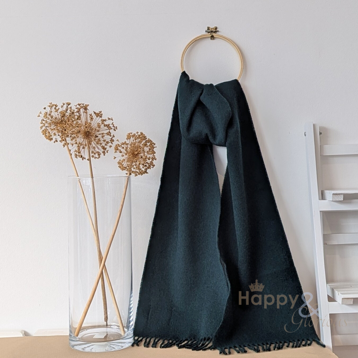 The soft woollen scarf is warm, luxurious and beautiful quality. The rich colours have real depth, and while the design is unpatterned, the fabric itself has a subtle character that makes it anything but plain.