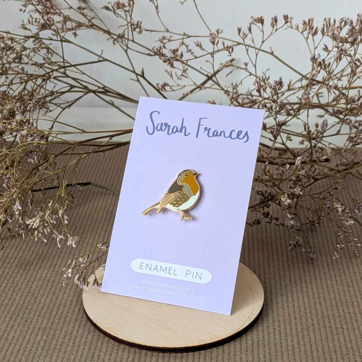 Based on an original illustration, this robin enamel pin is made in Devon, and is perfect for bird lovers! Add some flair to any jacket, backpack or tote. Made with shiny gold-coloured metal and hard enamel, the pin measures 1 inch (25mm) from beak to tail. It has a black rubber clasp on the back and is presented on a pretty backing card.